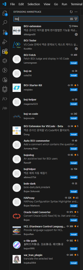 VS Code에서 extension에 BOJ만 검색해도 백준 테스트를 지원하는 항목이 많이 보인다.