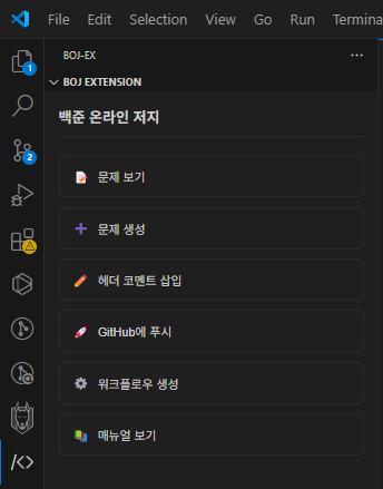 VS코드에서 문제보기를 통해서 문제 번호를 입력하면 문제 내용을 보여주고, 문제 생성을 클릭하면