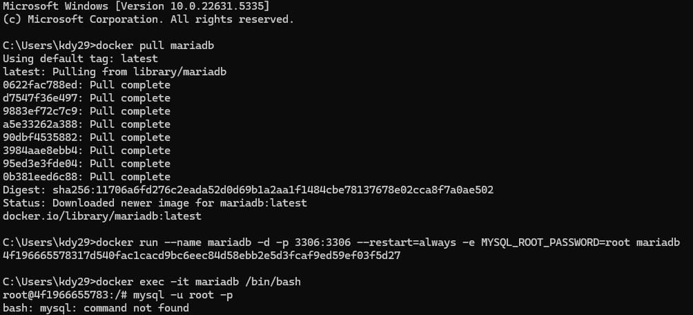 Git Bash로 명령어는 어느정도 수행하는데 실제로 mariadb를 실행하려고하니까 git bash에서는 동작하지않더라...
