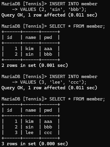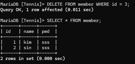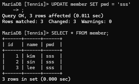 UPDATE member SET pwd = 'zzz' WHERE id = 3;