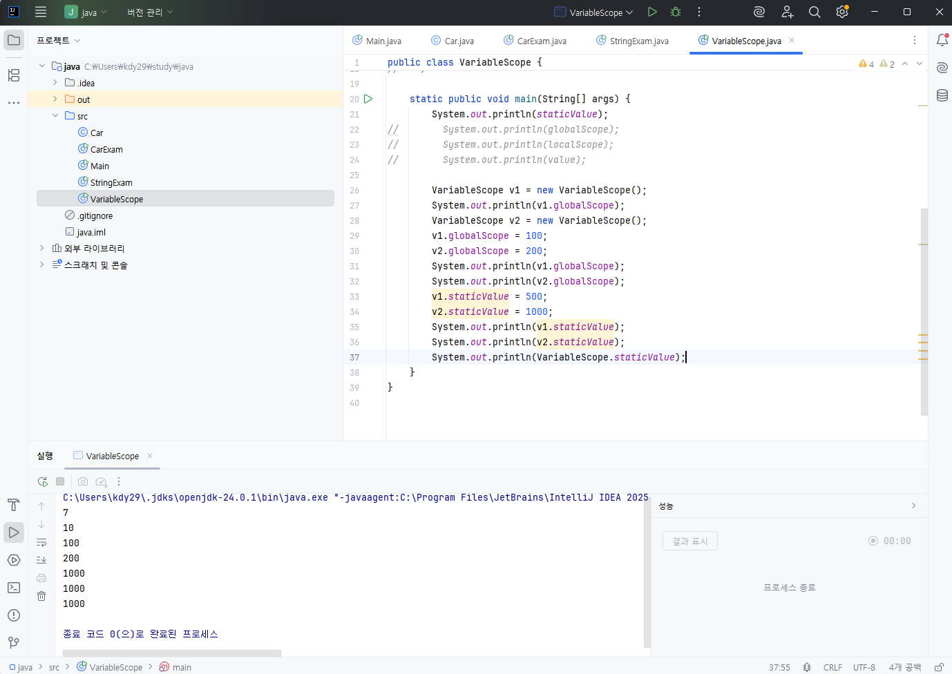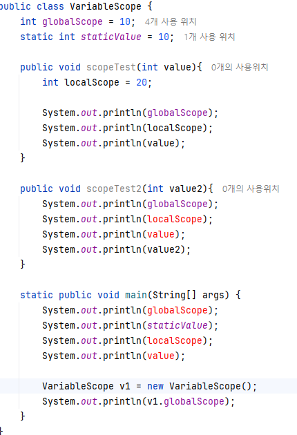 클래스에서 변수를 호출할 때, 중괄호 위치에 따라 또는 static 여부에 따라 호출할 수 있는 변수의 범위가 달라진다.