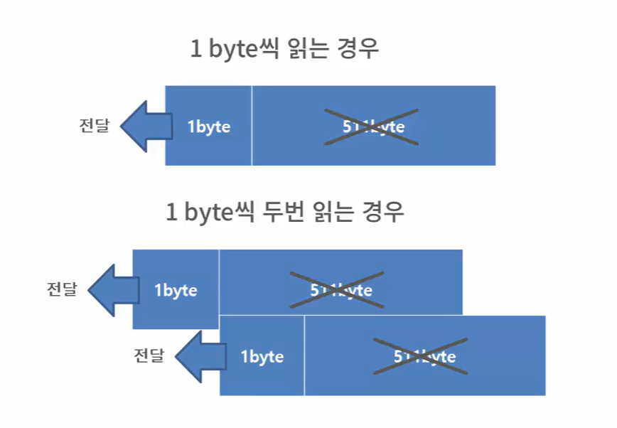 - 1byte씩 읽는 방식은 512 byte를 읽어와서 1byte를 제외한 나머지 511byte를 버림 (비효율적)