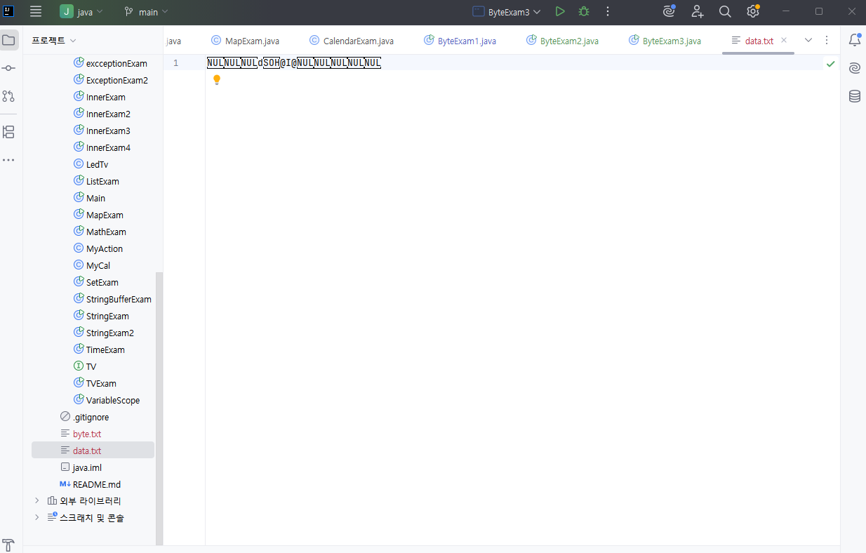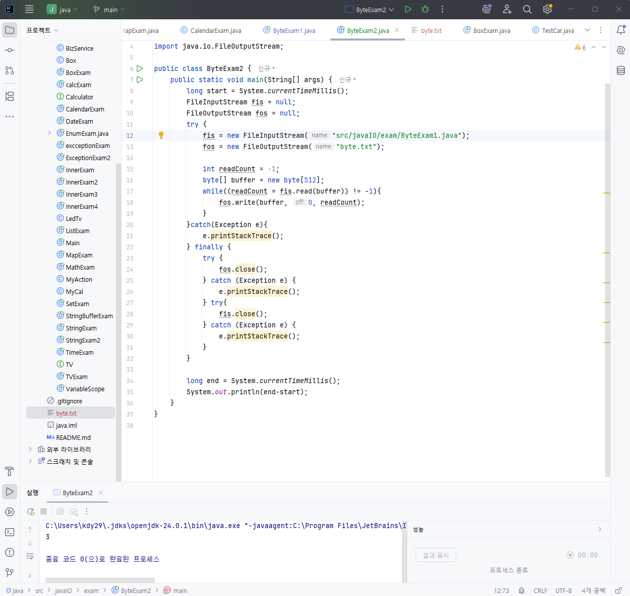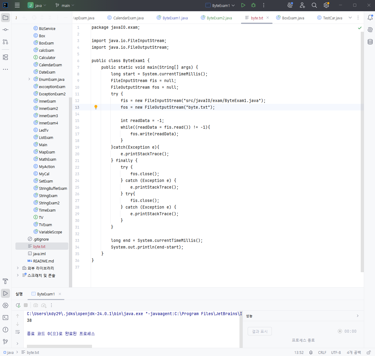 - ByteExam1.java파일을 실행했더니 byte.txt 파일에 ByteExam1.java파일의 내용과 동일한 내용을 복사함.