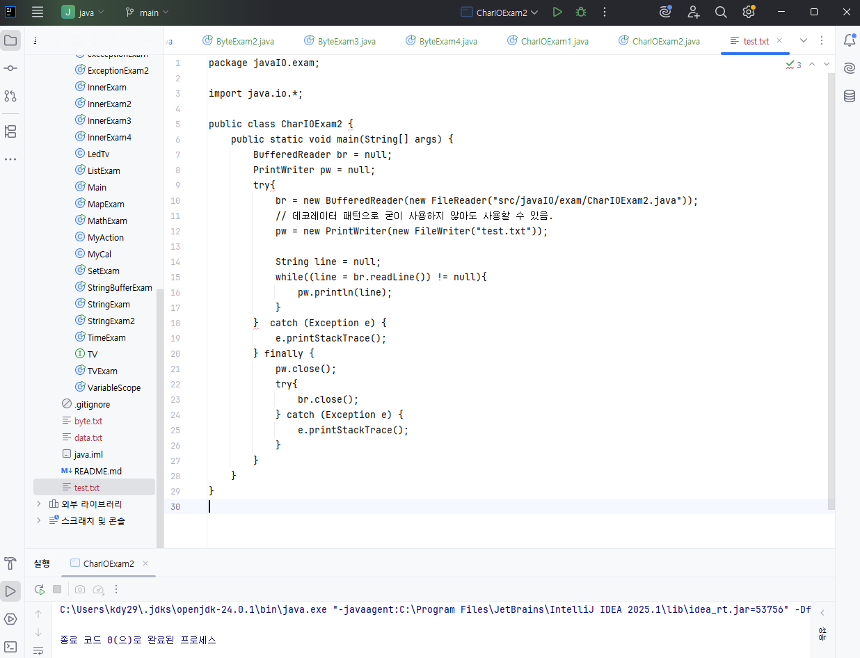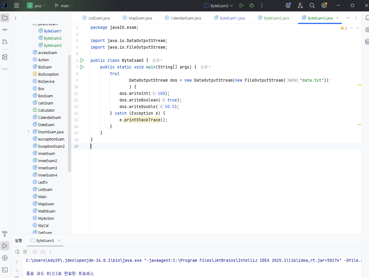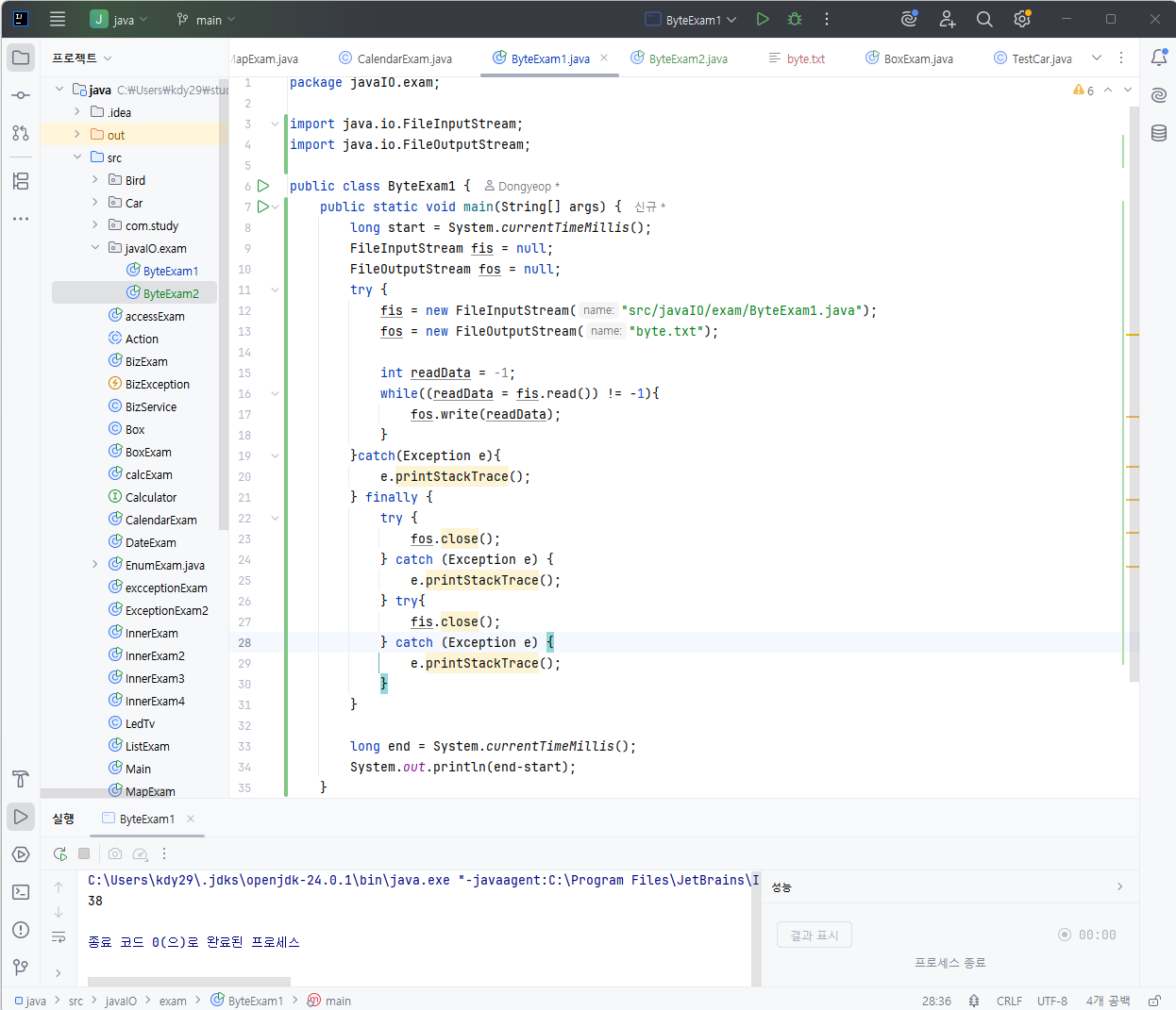 - ByteExam1.java파일을 실행했더니 byte.txt 파일에 ByteExam1.java파일의 내용과 동일한 내용을 복사함.