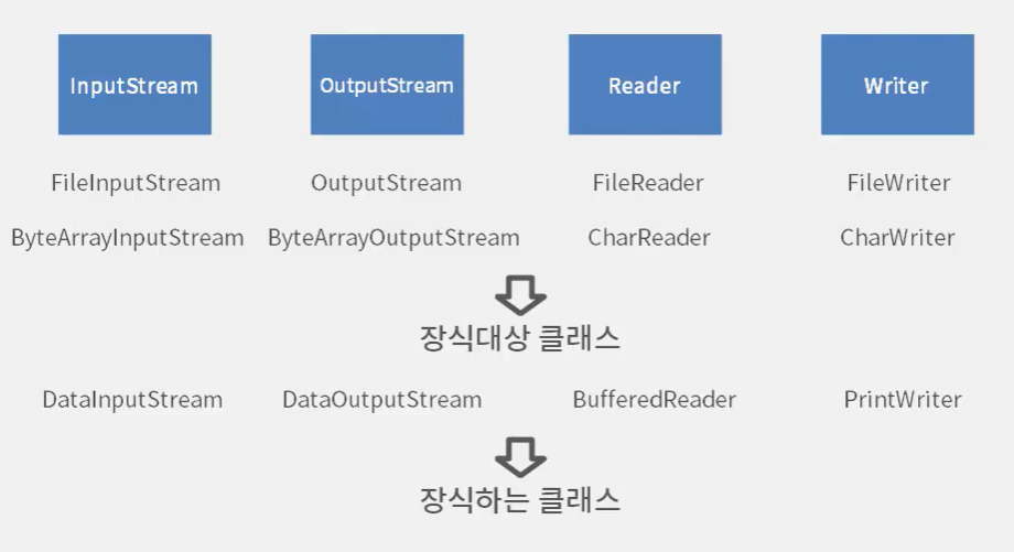 - byte 단위 입출력 클래스는 모두 InputStream과 OutputStream이라는 추상클래스를 상속받아 만들어짐.