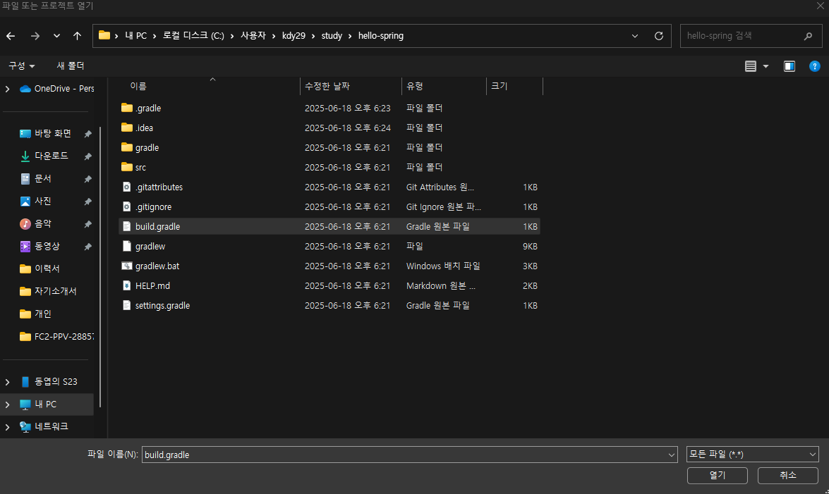 - build.gradle을 선택해서 프로젝트 열기