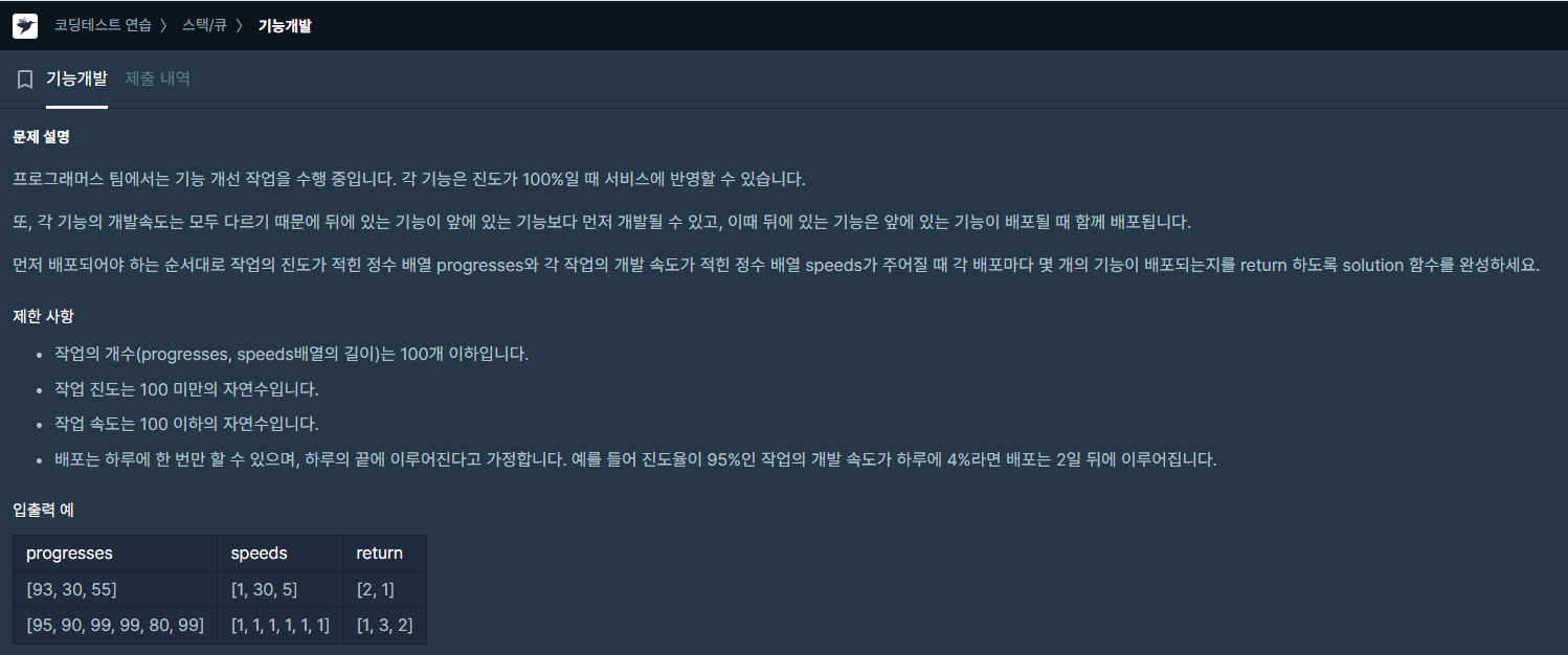- 각 기능의 개발 진도(progresses)와 개발 속도(speeds)가 주어짐