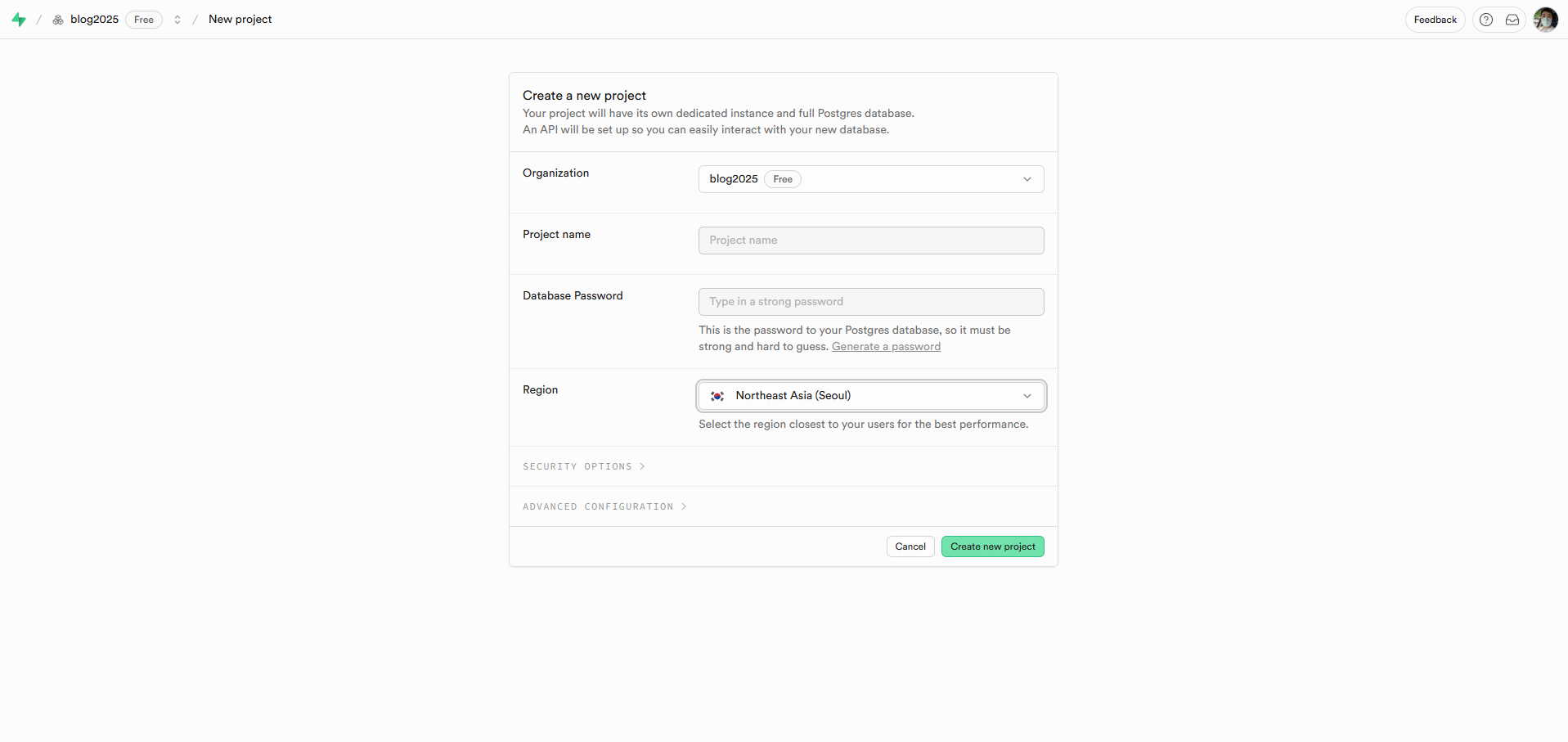 - 완료되면 자동으로 Postgres DB와 auth 시스템이 구성됨