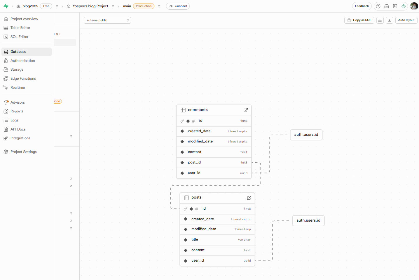 이번 글에서는 Supabase를 이용해 댓글 시스템에 필요한 테이블을 직접 생성하고, 외래 키(FK) 연결과 기본 설정을 마무리하는 과정을 소개합니다.