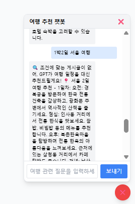 - 챗봇 기반 여행지 추천은 DB에 없어도 GPT에서 데이터를 가져오기 때문에 GPT 추가 연결