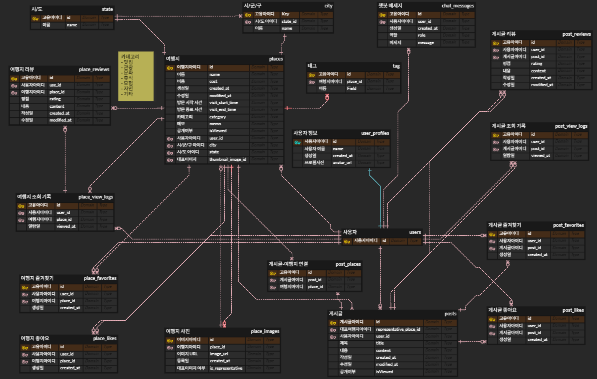 - post_places 중간 테이블을 통해 게시글과 여행지를 연결