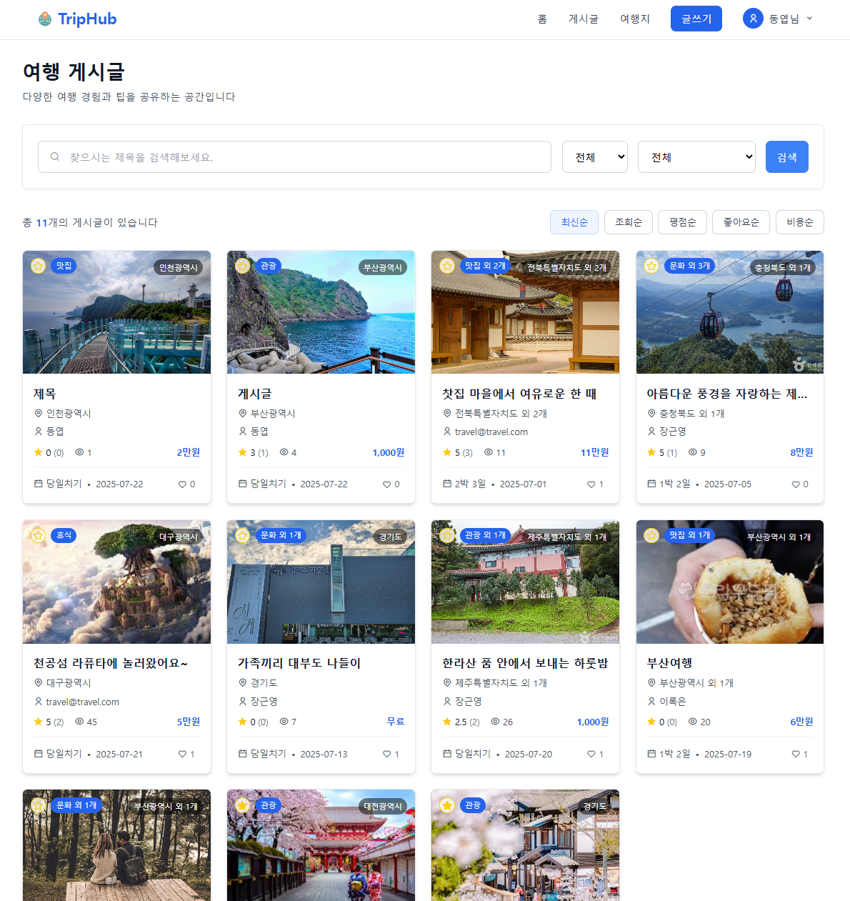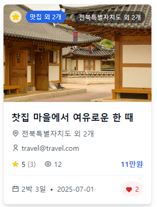 - 여행지/게시글 목록 피드 형태 제공