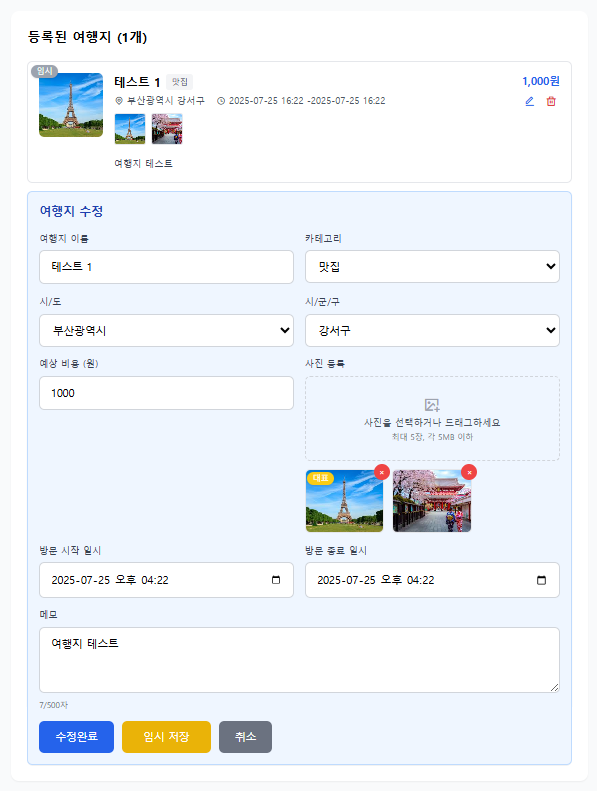 - 게시글/여행지 임시 저장 기능