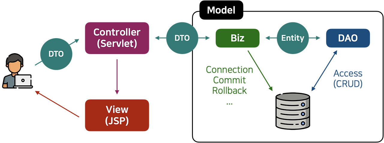 - 비즈니스 로직은 JSP에 직접 작성하지 않기 → Servlet, Service, DAO로 분리