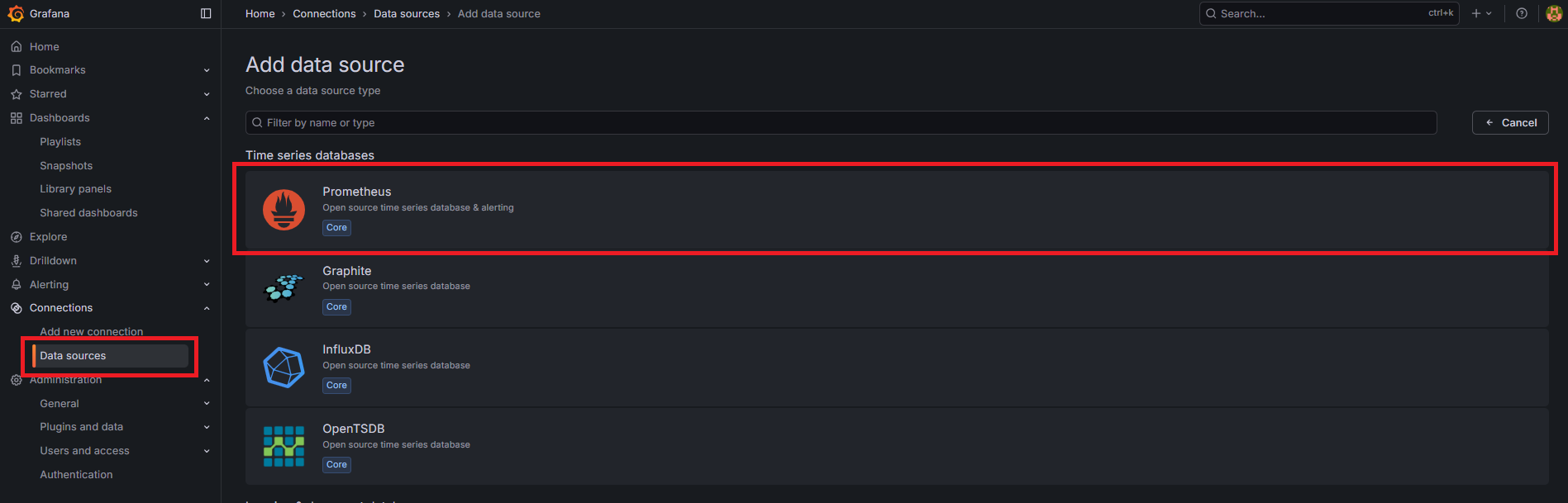 1. Connections → Data sources → Add data source →Prometheus 선택