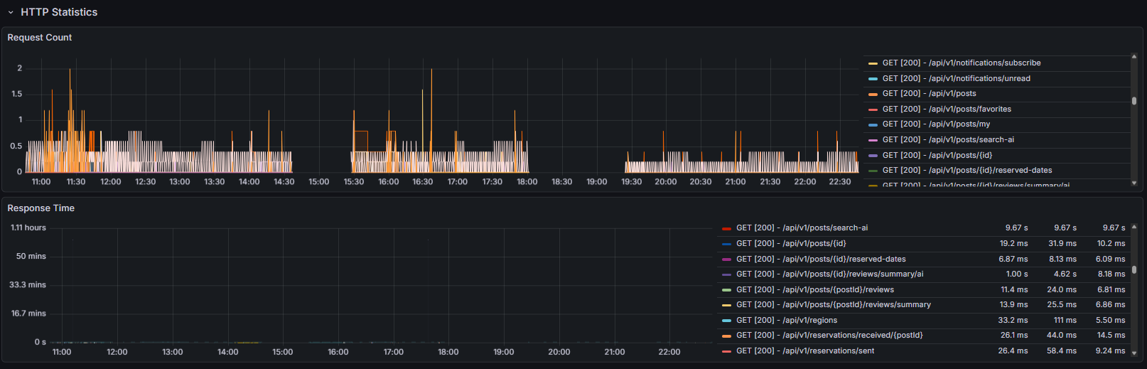 프로젝트에서는 Prometheus + Grafana 조합으로 JVM, 트래픽, 메모리 사용량을 실시간 모니터링할 수 있는 환경을 구축했다.