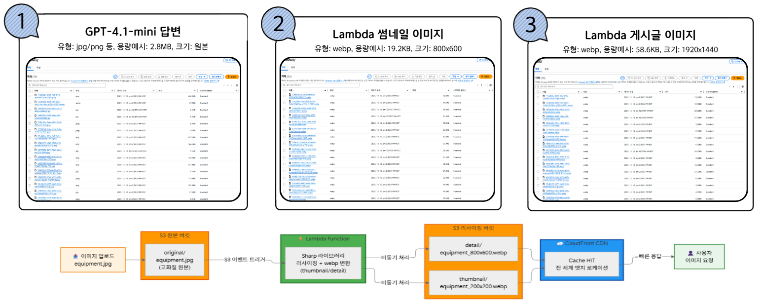 - S3 업로드 → Lambda 리사이징 → CloudFront CDN 캐싱