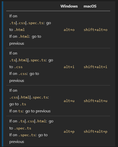 Angular에서 작업할 때 HTML, TypeScript, 사양 및 CSS 파일 사이를 자주 탐색해야 합니다. 이 작업은 쉬워 보이지만 실제로는 파일 간 전환이 지속적으로 필요한 여러 구성 요소에서 작업할 때 시간이 많이 걸리는 작업입니다.