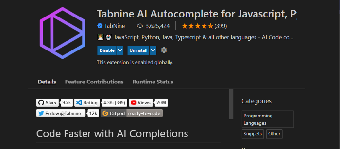 1. Tabnine AI Autocomplete for JavaScript, Python, Typescript, PHP, Go, Java, Ruby & more: