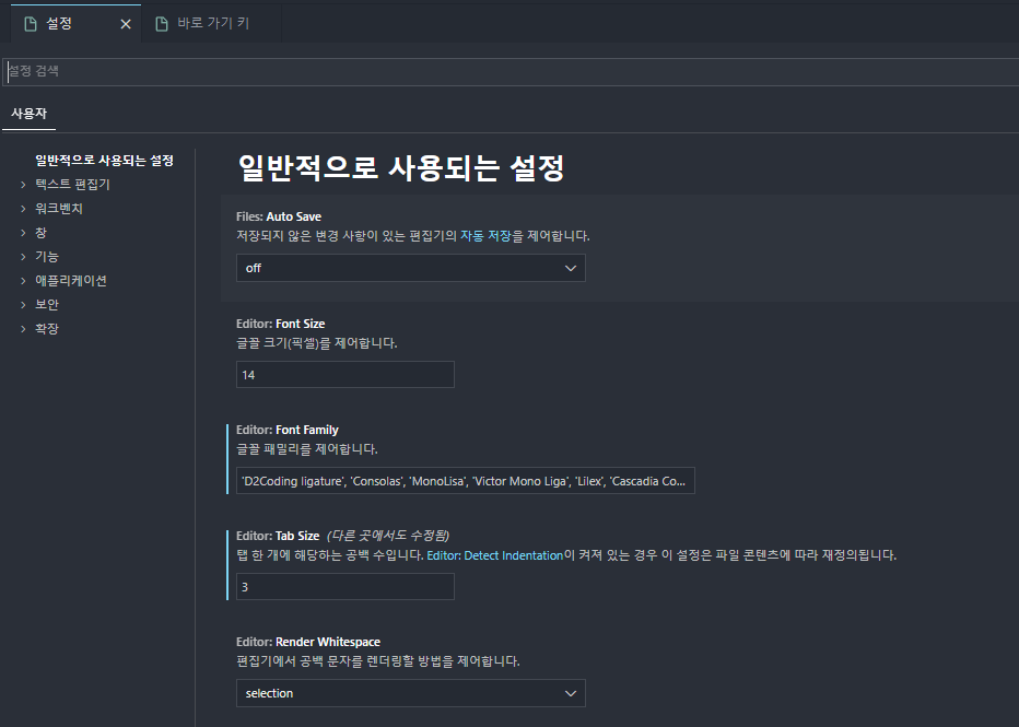 Ctrl + ,(콤마) : 설정창 열기