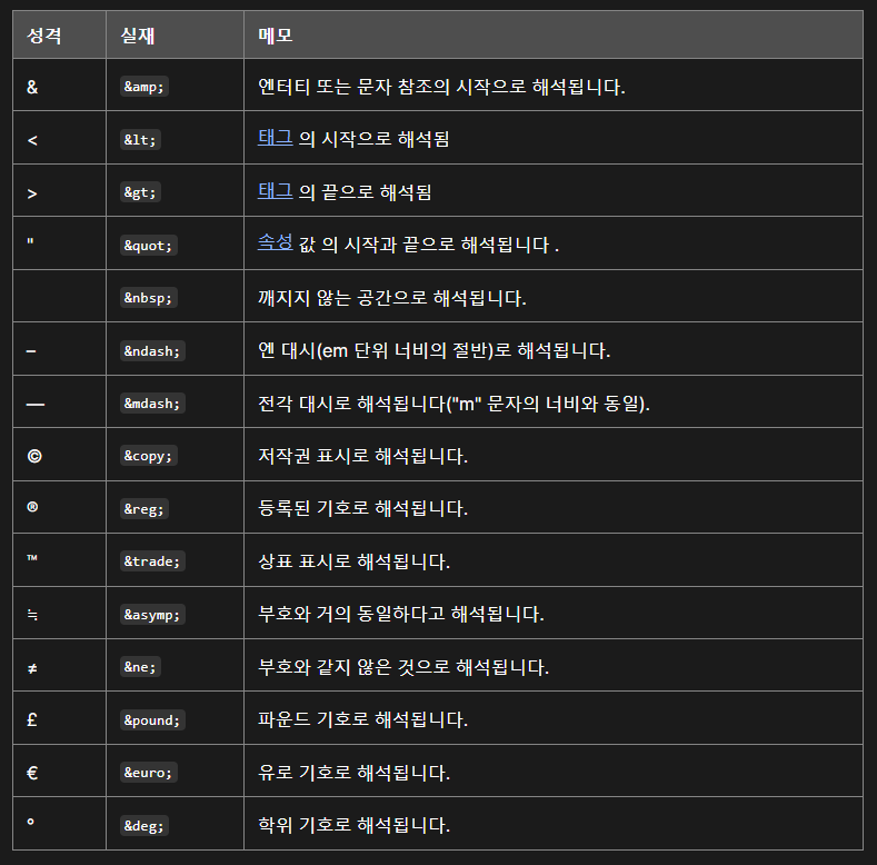 HTML 엔터티는 &(ampersand) 로 시작하고 ;(semicolon)으로 끝나는 텍스트 조각 (문자열) 입니다.