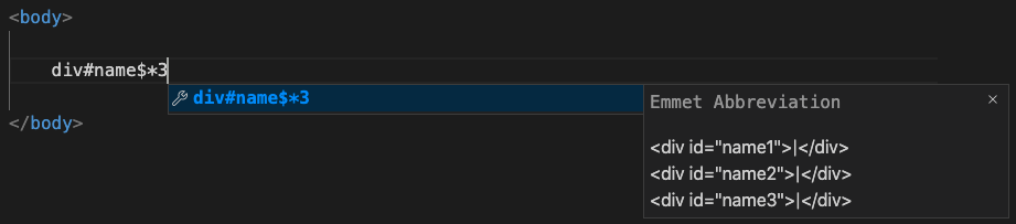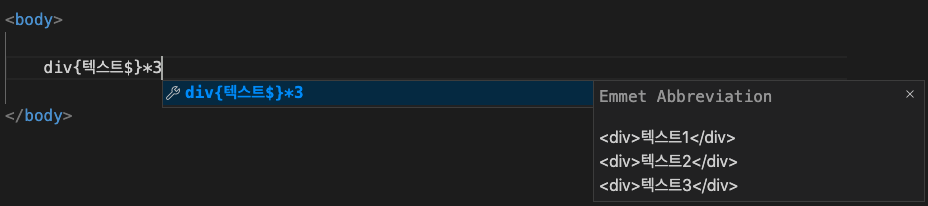 : $*n ( 아이디, 클래스, 텍스트 등에 사용 가능)