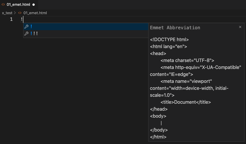 - html 파일을 만들고, 느낌표(!)만 입력하면 아래 화면 처럼 Emmet 자동완성 창이 동작한다.