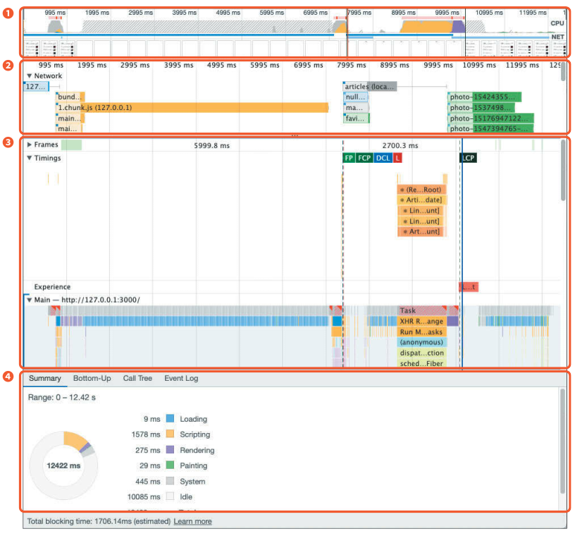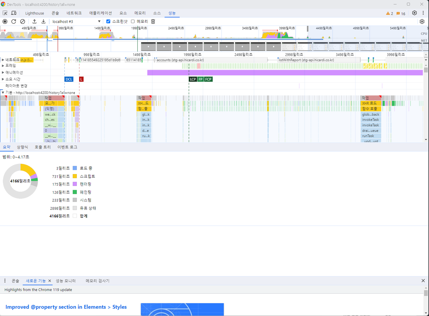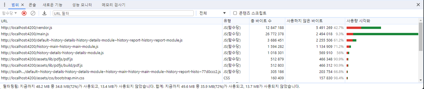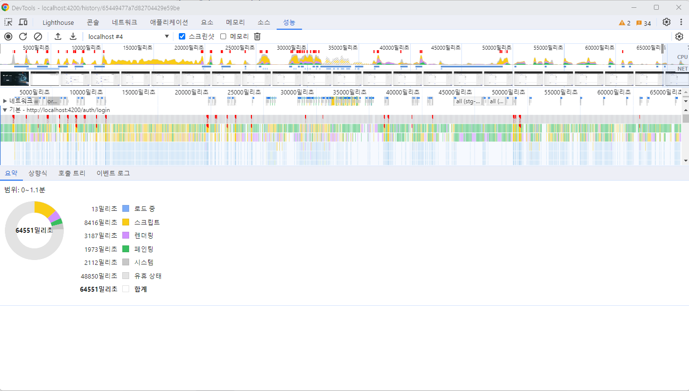 - 메인 스레드에서 실행되는 자바스크립트를 차트형태로 확인