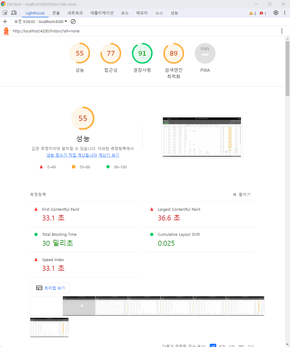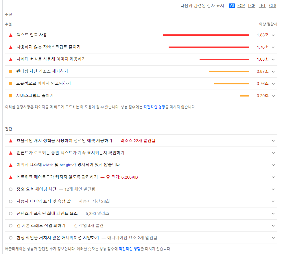 - 성능 점수를 측정하고 개선 가이드를 확인하여 중점 사항 분석 및 최적화