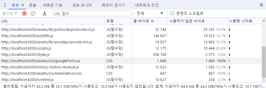 - 특정 파일에서 극히 일부의 코드만 실행되어 퍼센티지가 낮다면 불필요한 코드가 많음.