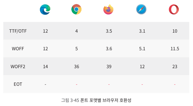- WOFF와 WOFF2는 브라우저 호환성 문제가 있을 수 있음