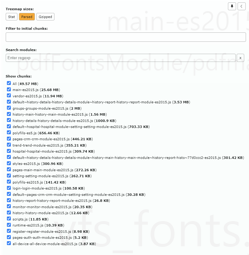 - webpack을 실행하거나 npm명령을 입력하면 현재 프로젝트의 번들링 파일이 어떠한 모듈을 포함하고 있고, 크기는 얼마인지 번들링 파일별로 확인