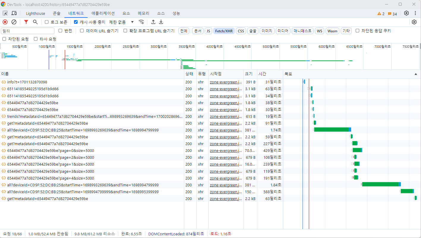 - 현재 웹 페이지에서 발생하는 모든 네트워크 트래픽을 확인